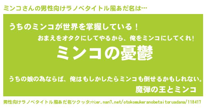 | 女子向けラノベタイトル風あだ名 | 『(仮)ミンコのやんごとなき事情』 |