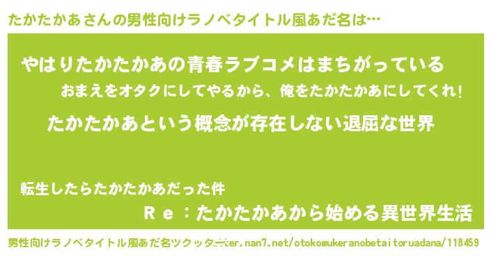 | 女子向けラノベタイトル風あだ名 | 『異世界で失敗しない100のたかたかあ』 |