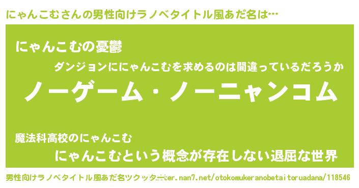 | 女子向けラノベタイトル風あだ名 | 『死神にゃんこむの再婚』 |