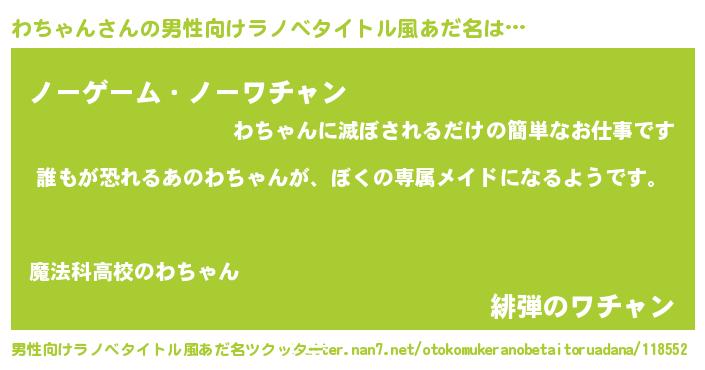 | 女子向けラノベタイトル風あだ名 | 『わちゃんの契約王妃』 |