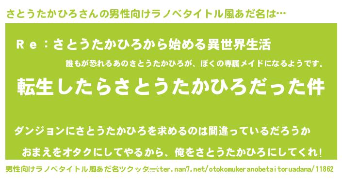 | 女子向けラノベタイトル風あだ名 | 『さとうたかひろの玉の輿計画!』 |