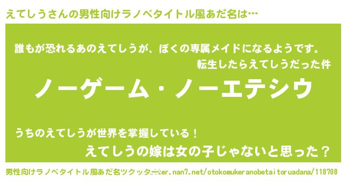 | 女子向けラノベタイトル風あだ名 | 『えてしう恋絵巻』『えてしうの契約王妃』 |