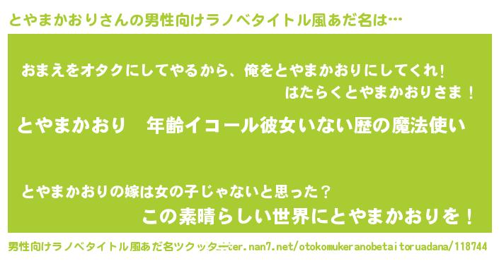 | 女子向けラノベタイトル風あだ名 | 『とやまかおりの玉の輿計画!』 |