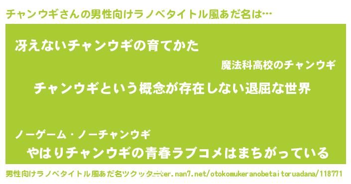 | 女子向けラノベタイトル風あだ名 | 『異世界で失敗しない100のチャンウギ』 |