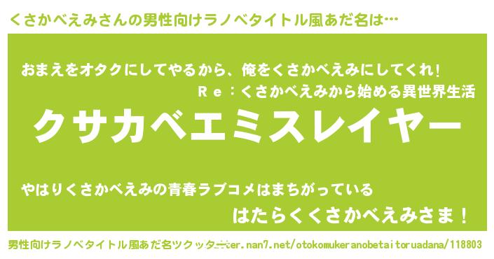 | 胡散臭い通販商品みたいなあだ名 | 『100人中100人が認めたイリジウム磁石…その名も「くさかべえみ」』 |