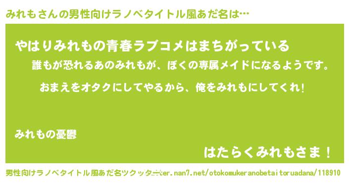 | 女子向けラノベタイトル風あだ名 | 『みれも恋絵巻』『みれもの雑貨屋さん』 |