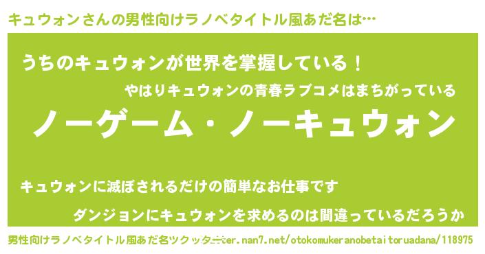 | 女子向けラノベタイトル風あだ名 | 『死神キュウォンの再婚』 |
