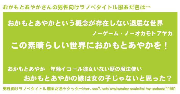 | 女子向けラノベタイトル風あだ名 | 『乙女ゲームの破滅フラグしかない悪役おかもとあやかに転生してしまった…』 |