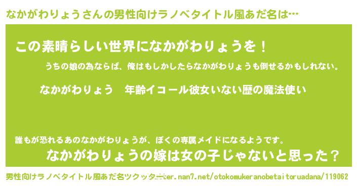 | 女子向けラノベタイトル風あだ名 | 『なかがわりょうの玉の輿計画!』 |