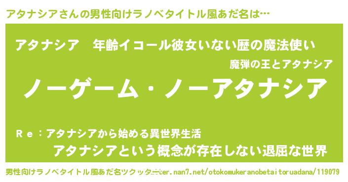 | 女子向けラノベタイトル風あだ名 | 『死神アタナシアの再婚』 |