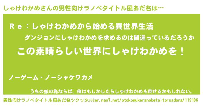 | 女子向けラノベタイトル風あだ名 | 『乙女ゲームの破滅フラグしかない悪役しゃけわかめに転生してしまった…』 |