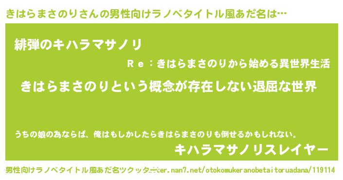 | 女子向けラノベタイトル風あだ名 | 『異世界で失敗しない100のきはらまさのり』 |