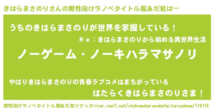 | 女子向けラノベタイトル風あだ名 | 『死神きはらまさのりの再婚』 |