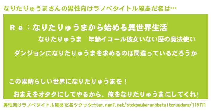 | 女子向けラノベタイトル風あだ名 | 『なりたりゅうまの卵を拾いまして』 |