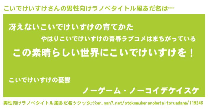 | 女子向けラノベタイトル風あだ名 | 『悪役こいでけいすけに転生したようですが、知った事ではありません』 |
