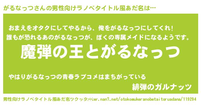 | 女子向けラノベタイトル風あだ名 | 『がるなっつが死なない童話 林檎のがるなっつの診療簿』 |