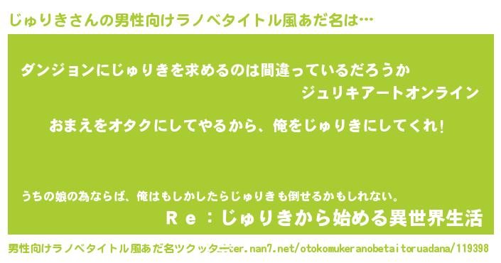 | 女子向けラノベタイトル風あだ名 | 『じゅりき夫妻のなれそめ』 |