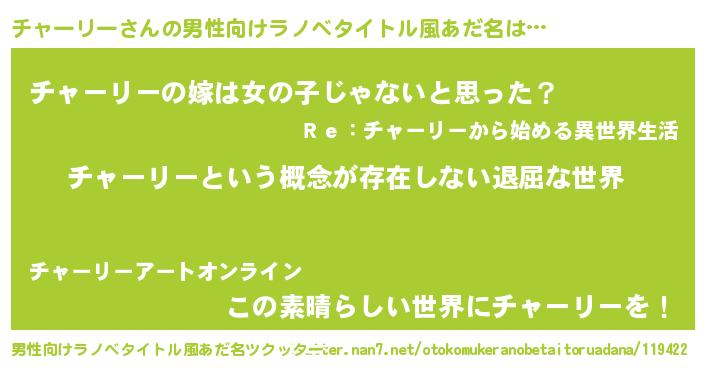 | 胡散臭い通販商品みたいなあだ名 | 『来世でも幸せになれる水素水…その名も「チャーリー」』 |