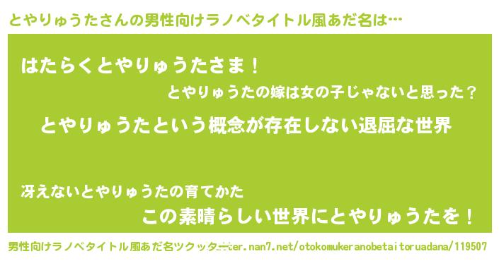 | 胡散臭い通販商品みたいなあだ名 | 『来世でも幸せになれる健康食品…その名も「とやりゅうた」』 |