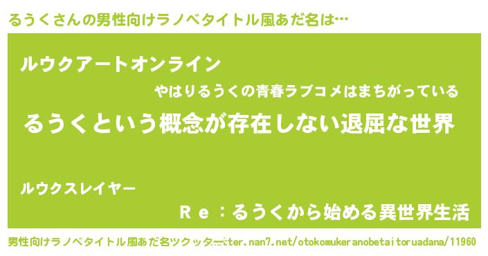 | 女子向けラノベタイトル風あだ名 | 『異世界で失敗しない100のるうく』 |