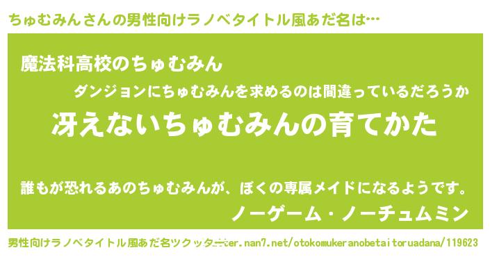 | 女子向けラノベタイトル風あだ名 | 『シンデレラちゅむみん家の靴箱館』 |