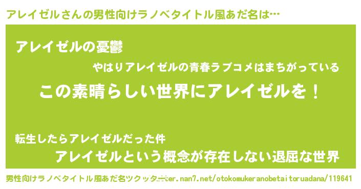 | 女子向けラノベタイトル風あだ名 | 『悪役アレイゼルに転生したようですが、知った事ではありません』 |