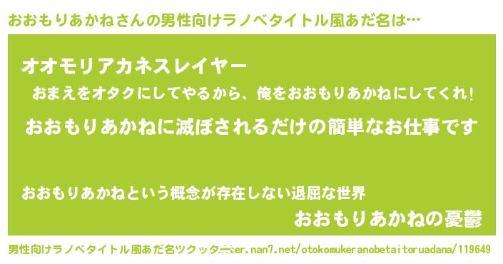 | 女子向けラノベタイトル風あだ名 | 『横柄おおもりあかねと宰相陛下』 |