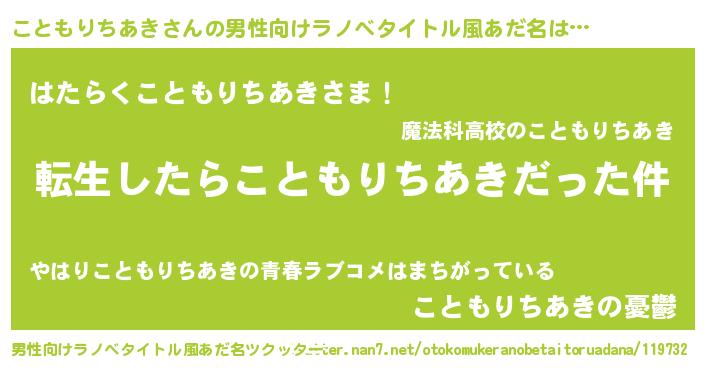 | 女子向けラノベタイトル風あだ名 | 『こともりちあきの玉の輿計画!』 |
