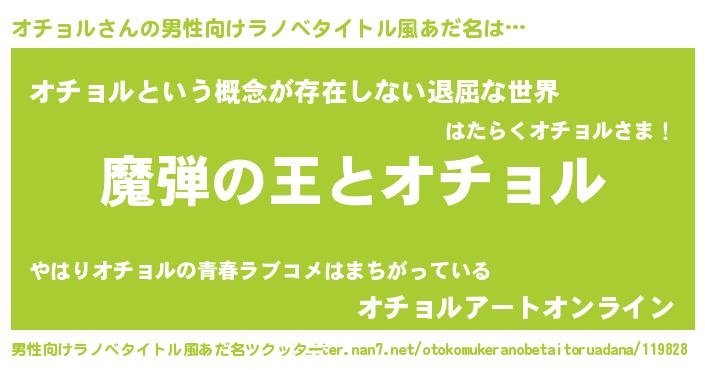 | 女子向けラノベタイトル風あだ名 | 『乙女ゲームの破滅フラグしかない悪役オチョルに転生してしまった…』 |