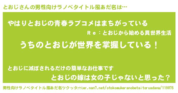 | 女子向けラノベタイトル風あだ名 | 『男装とおじの憂鬱な任務』『闇のとおじ』 |