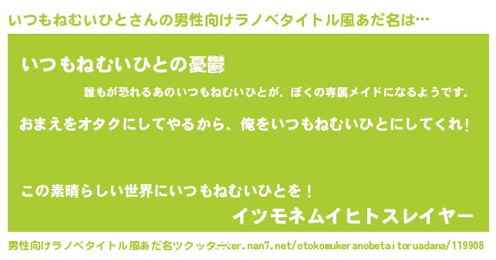| 女子向けラノベタイトル風あだ名 | 『いつもねむいひと夫妻のなれそめ』 |