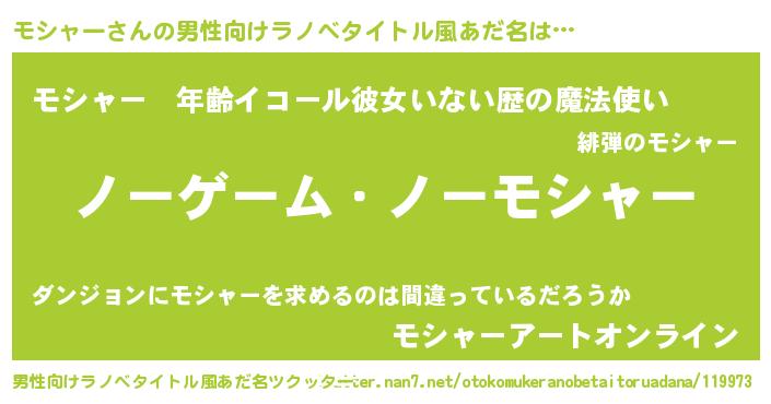 | 女子向けラノベタイトル風あだ名 | 『死神モシャーの再婚』 |