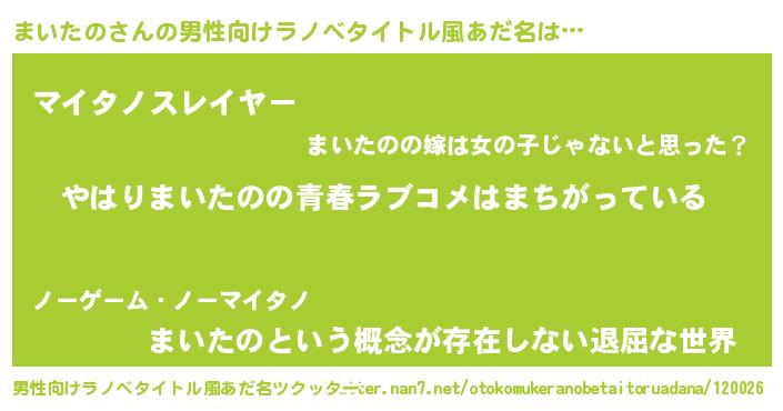 | 女子向けラノベタイトル風あだ名 | 『まいたの伯爵の花嫁』 |