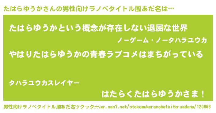 | 女子向けラノベタイトル風あだ名 | 『たはらゆうかの雑貨屋さん』 |