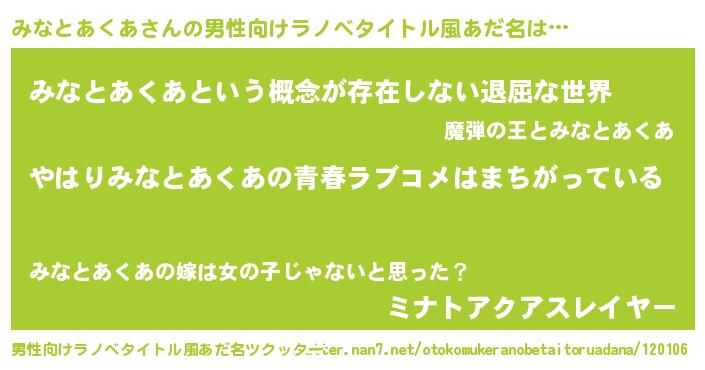 | 女子向けラノベタイトル風あだ名 | 『みなとあくあの雑貨屋さん』 |