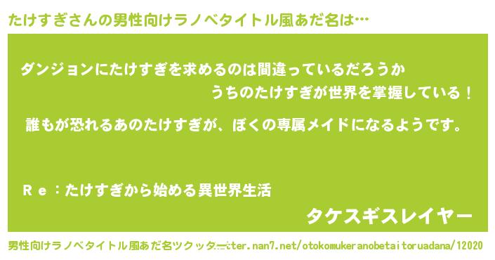 | 女子向けラノベタイトル風あだ名 | 『異世界でカフェたけすぎを開店しました。』 |