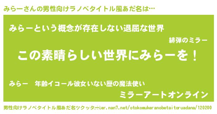 | 意味不明あだ名 | 『住所不定無職みらー(7歳)』 |
