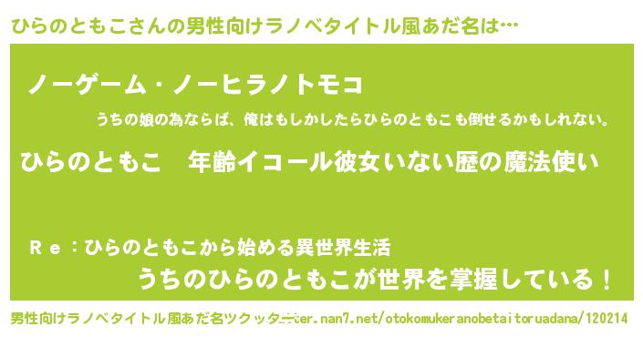 | 女子向けラノベタイトル風あだ名 | 『ひらのともこの玉の輿計画!』 |
