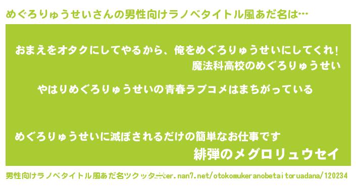 | 女子向けラノベタイトル風あだ名 | 『めぐろりゅうせい伯爵の花嫁』 |