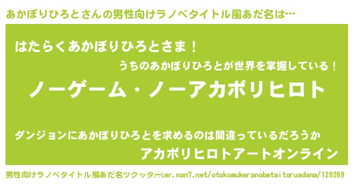 | 女子向けラノベタイトル風あだ名 | 『死神あかぼりひろとの再婚』 |