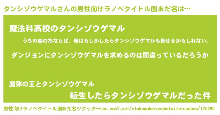 | 女子向けラノベタイトル風あだ名 | 『タンシゾウゲマルの卵を拾いまして』 |
