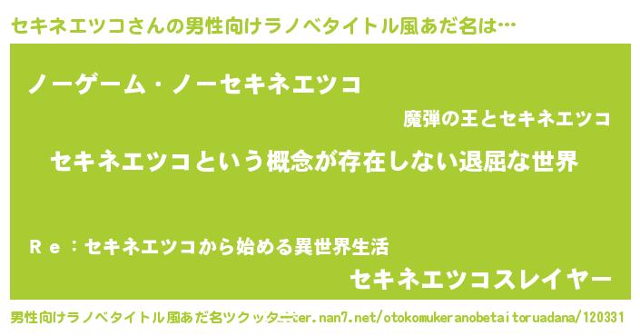 | 女子向けラノベタイトル風あだ名 | 『異世界で失敗しない100のセキネエツコ』 |