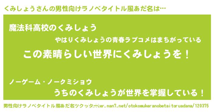 | 女子向けラノベタイトル風あだ名 | 『悪役くみしょうに転生したようですが、知った事ではありません』 |