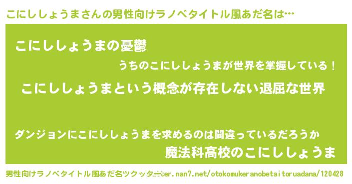 | 女子向けラノベタイトル風あだ名 | 『こにししょうまの契約王妃』 |