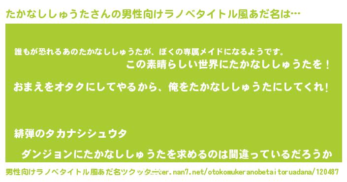| 女子向けラノベタイトル風あだ名 | 『たかなししゅうた夫妻のなれそめ』 |