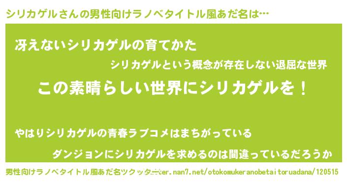 | 女子向けラノベタイトル風あだ名 | 『乙女ゲームの破滅フラグしかない悪役シリカゲルに転生してしまった…』 |