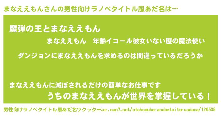 | 女子向けラノベタイトル風あだ名 | 『まなええもんは平凡を望む』 |