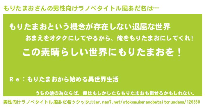 | 女子向けラノベタイトル風あだ名 | 『乙女ゲームの破滅フラグしかない悪役もりたまおに転生してしまった…』 |