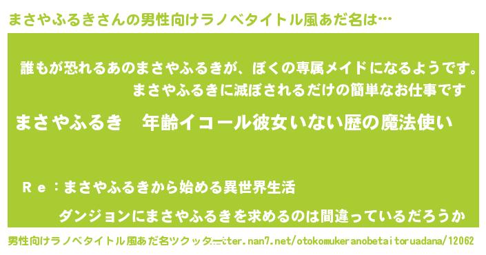 | 女子向けラノベタイトル風あだ名 | 『まさやふるきの玉の輿計画!』 |