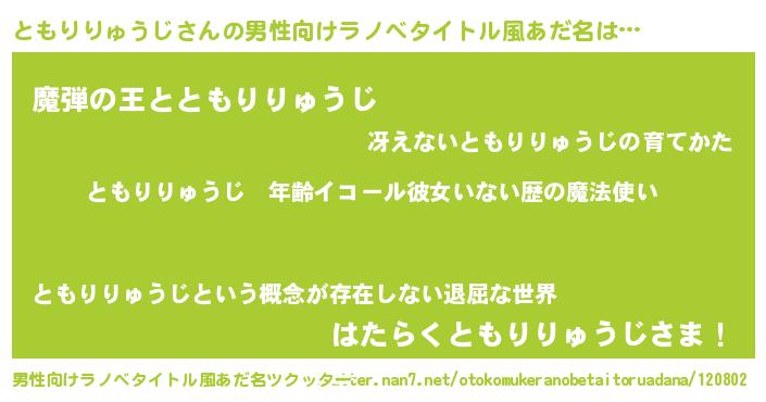 | 女子向けラノベタイトル風あだ名 | 『ともりりゅうじの玉の輿計画!』 |